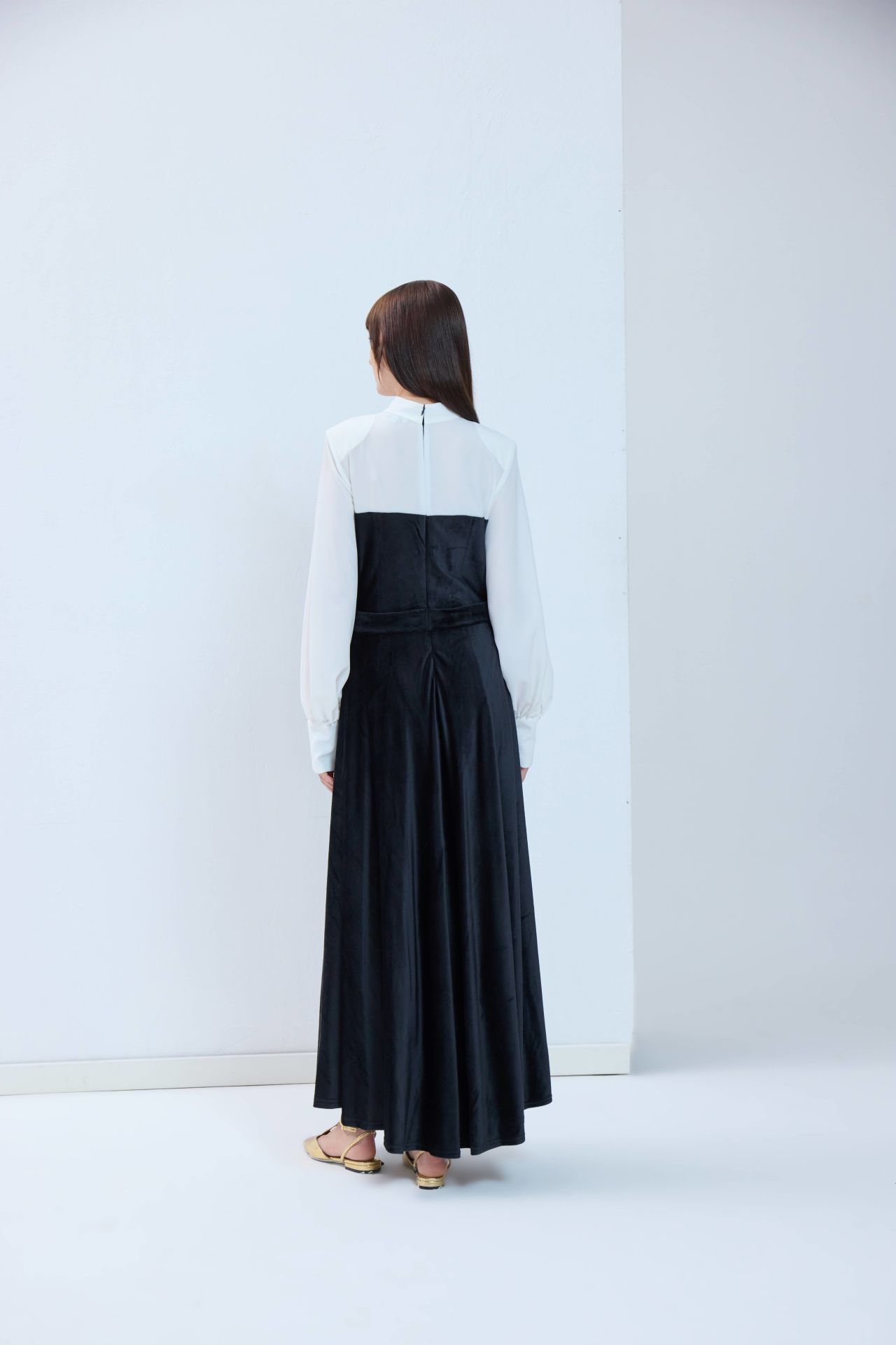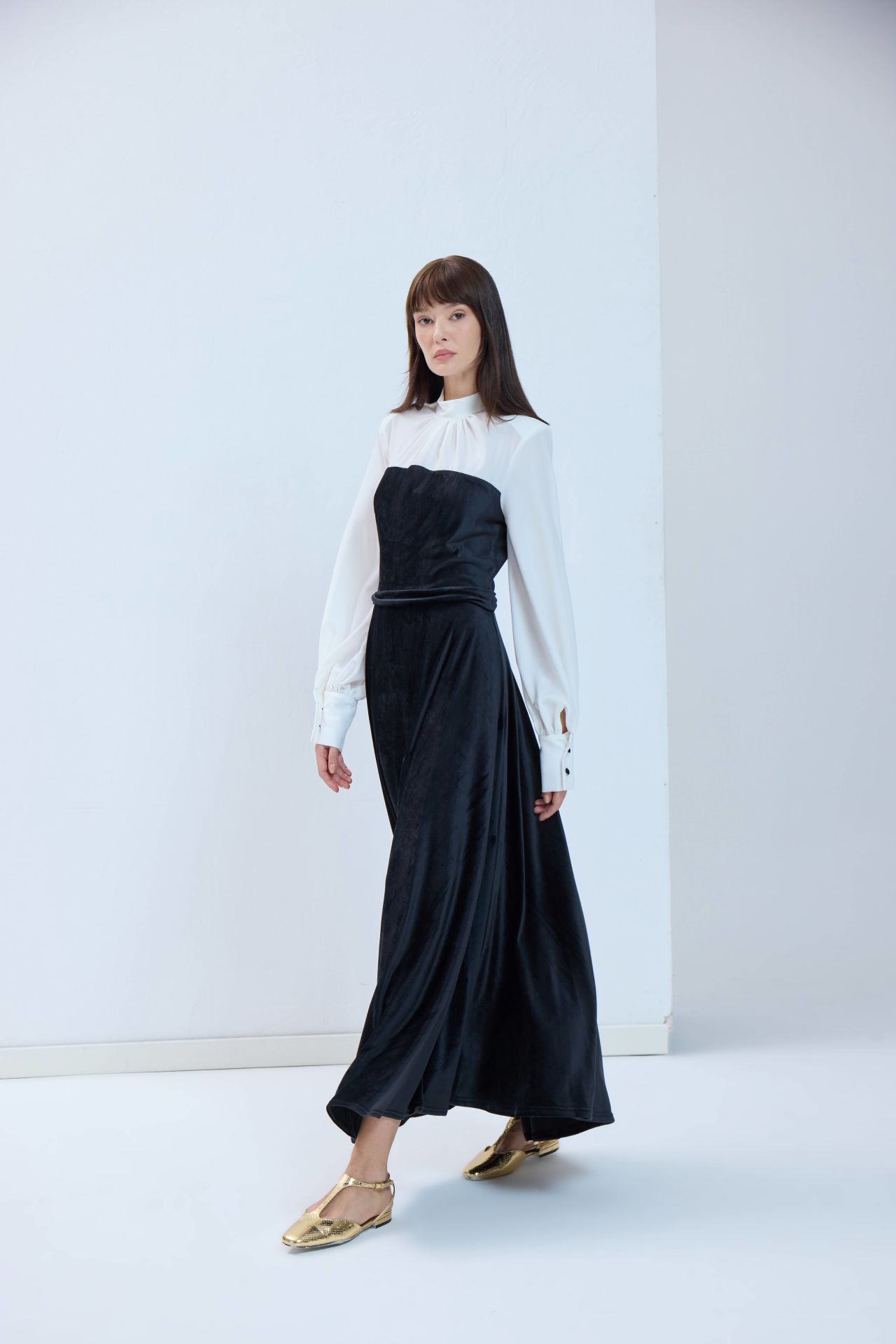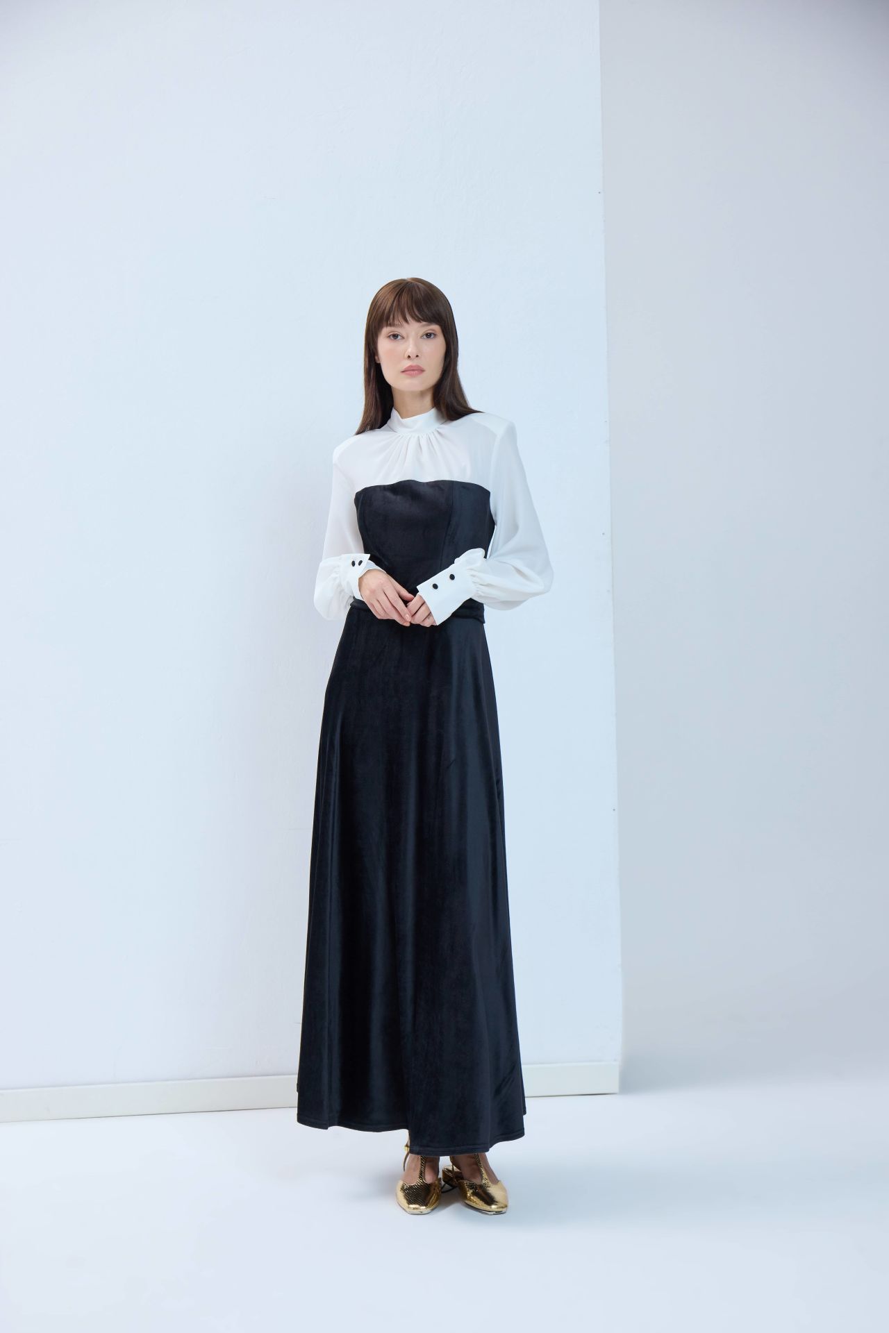 Uzun kloş eteği, manşetli uzun kolları ve sırttan fermuarıyla elbisemiz elegan bir siluete sahiptir. Bu kadife elbise hem günlük kullanımda, hem özel günlerde güzelliğinizi ve zerafetinizi ön plana çıkaracaktır.