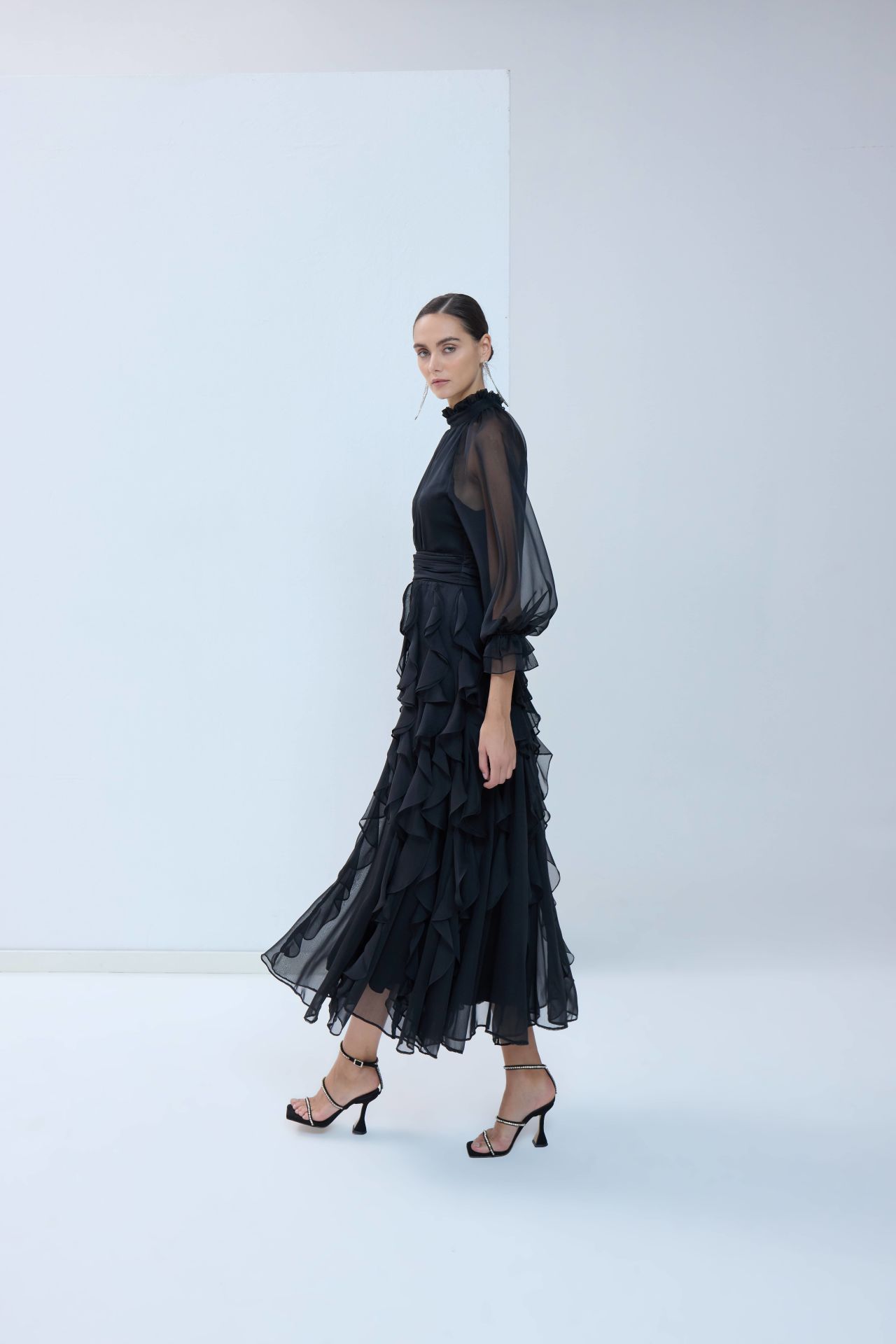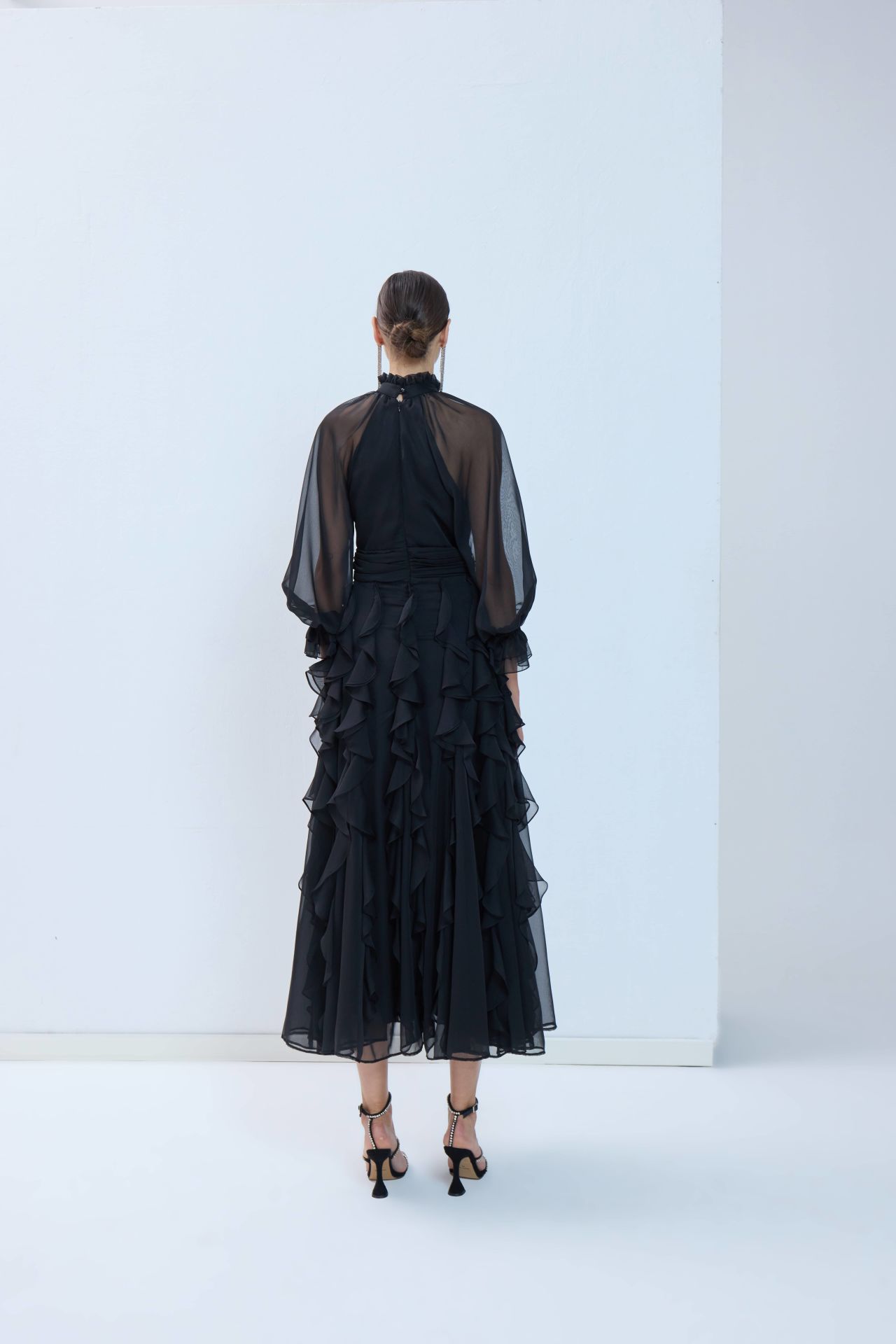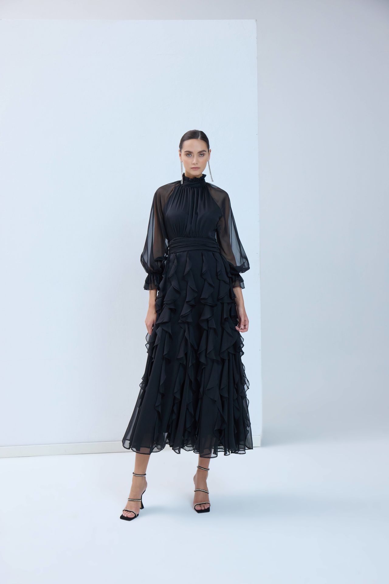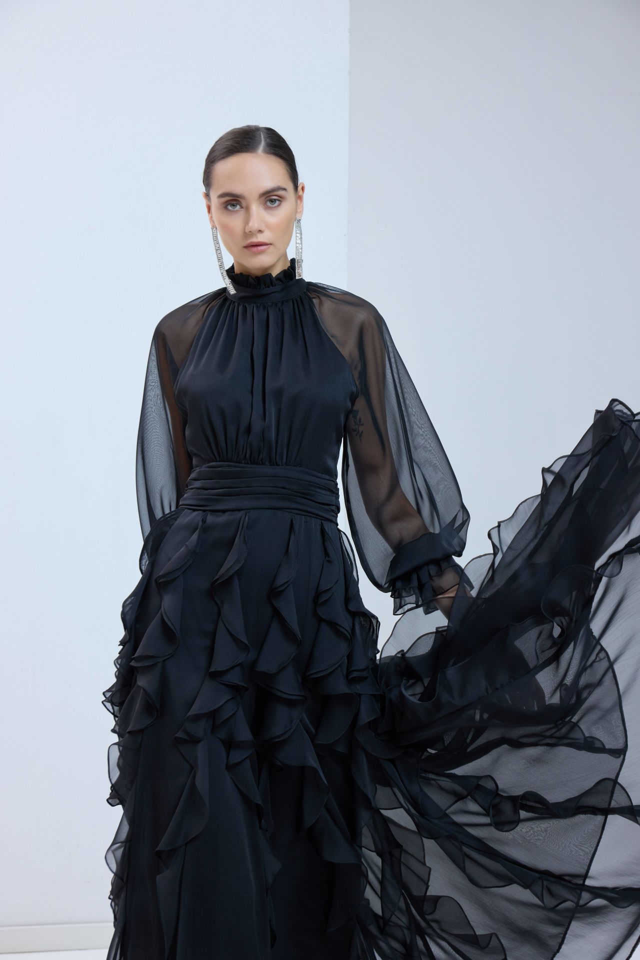 Reglan kollu, özel tasarım elbisemiz sizi rutin hayatın sıkıntısından çekip alır. Uçuşan kloş eteği ve dikey fırfırları sizi her giydiğinizde çocuksu bir neşeyle gülümsetir.