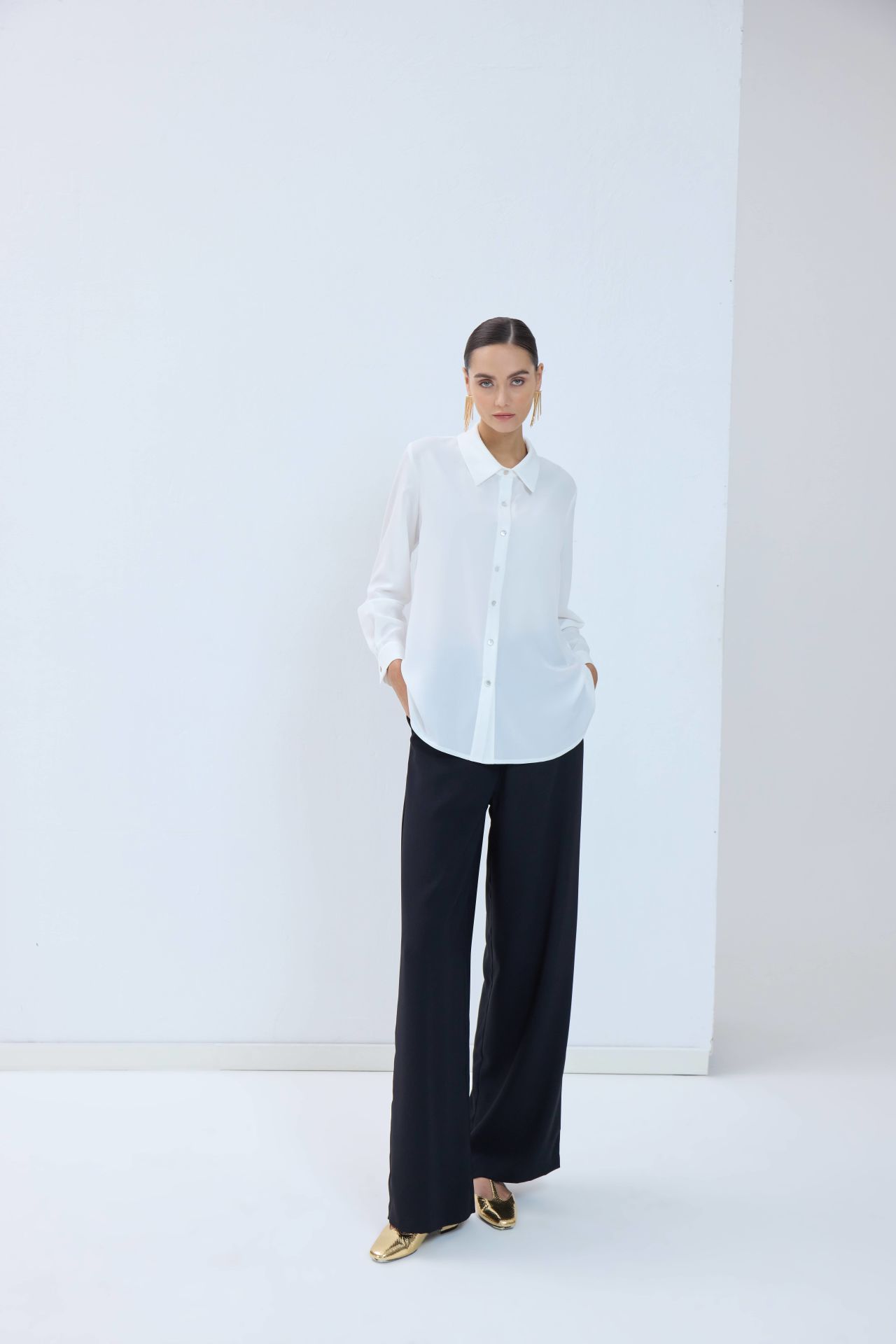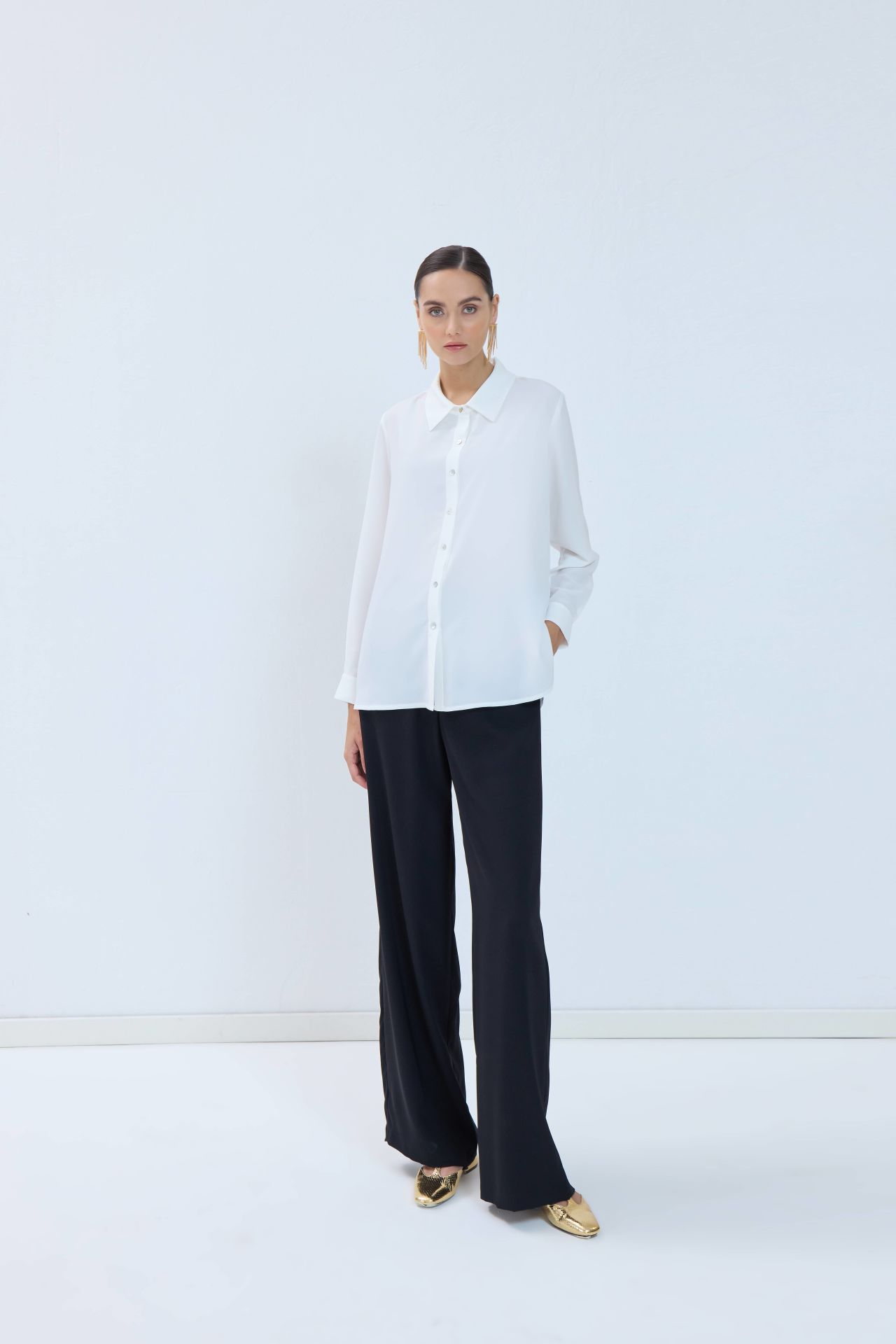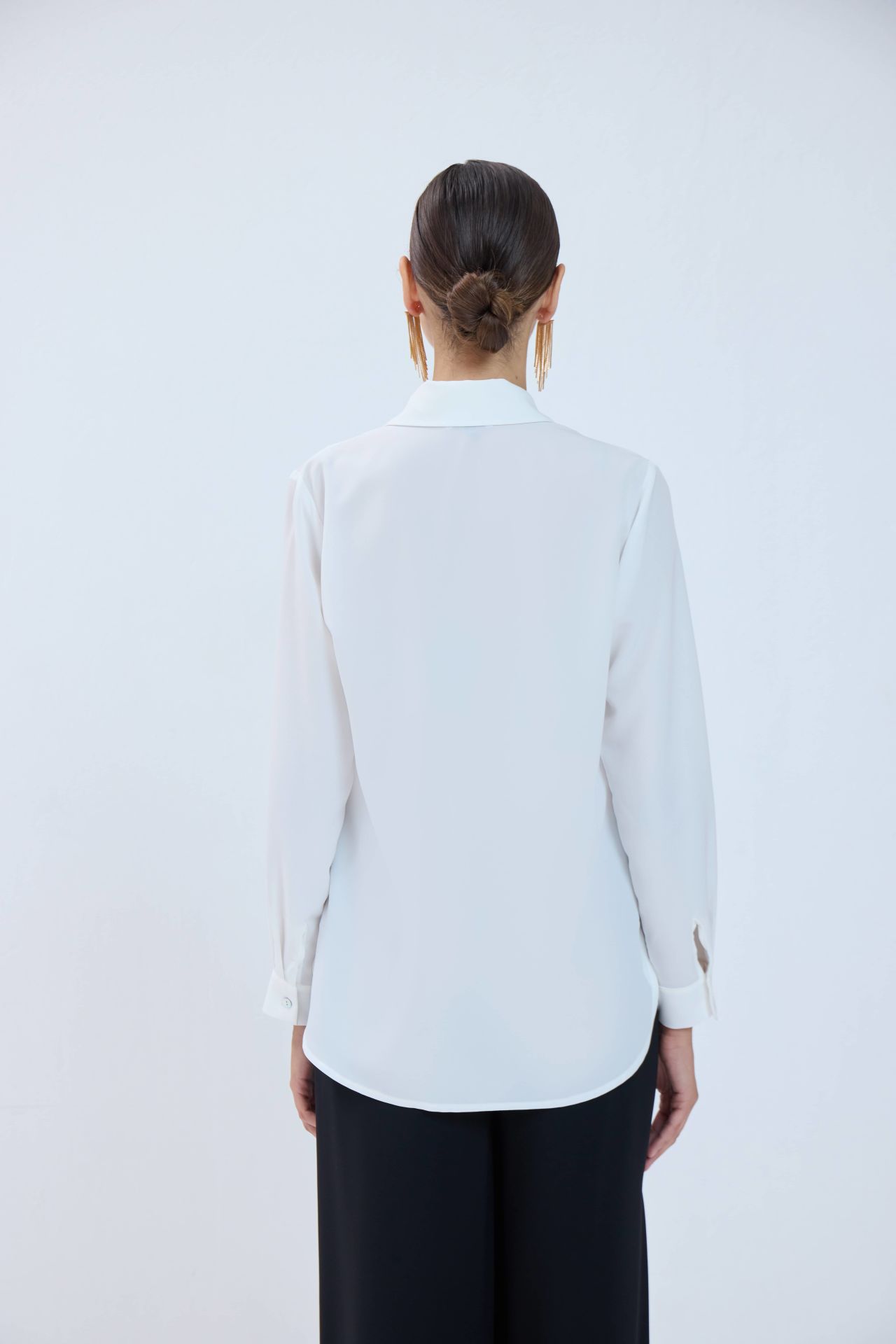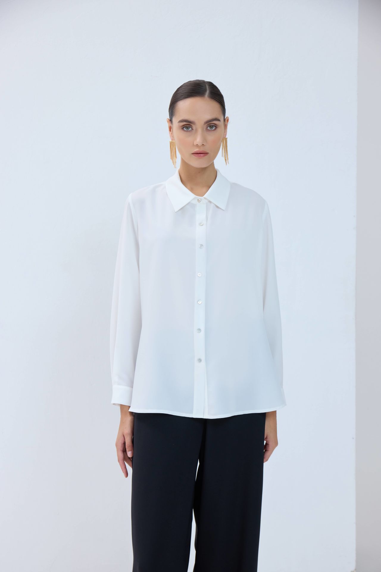 Standart kalıp, hafif krep kumaştan yapılma gömlek. Dokunuşundaki yumuşaklığına bayılacaksınız.