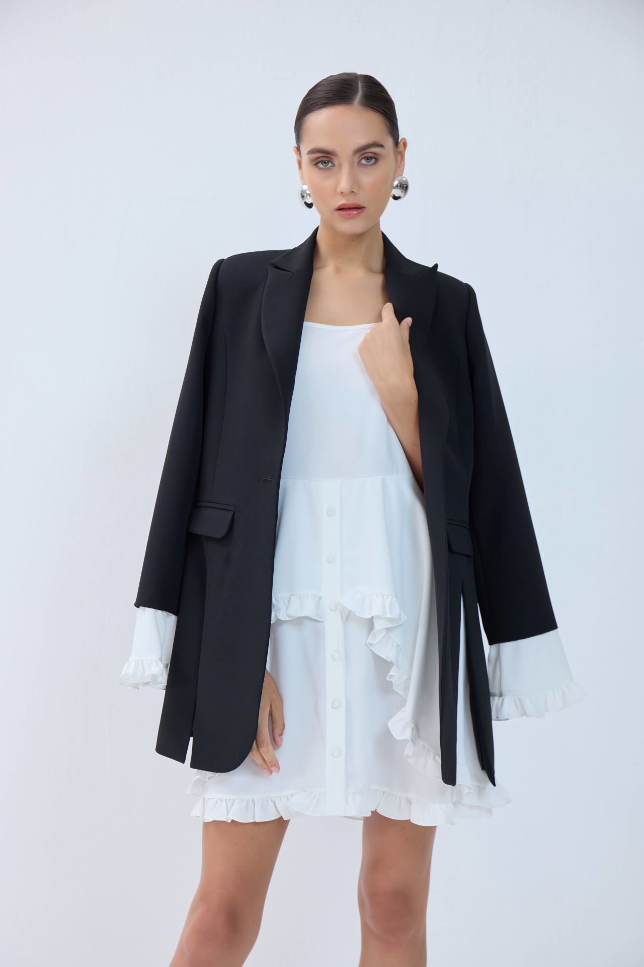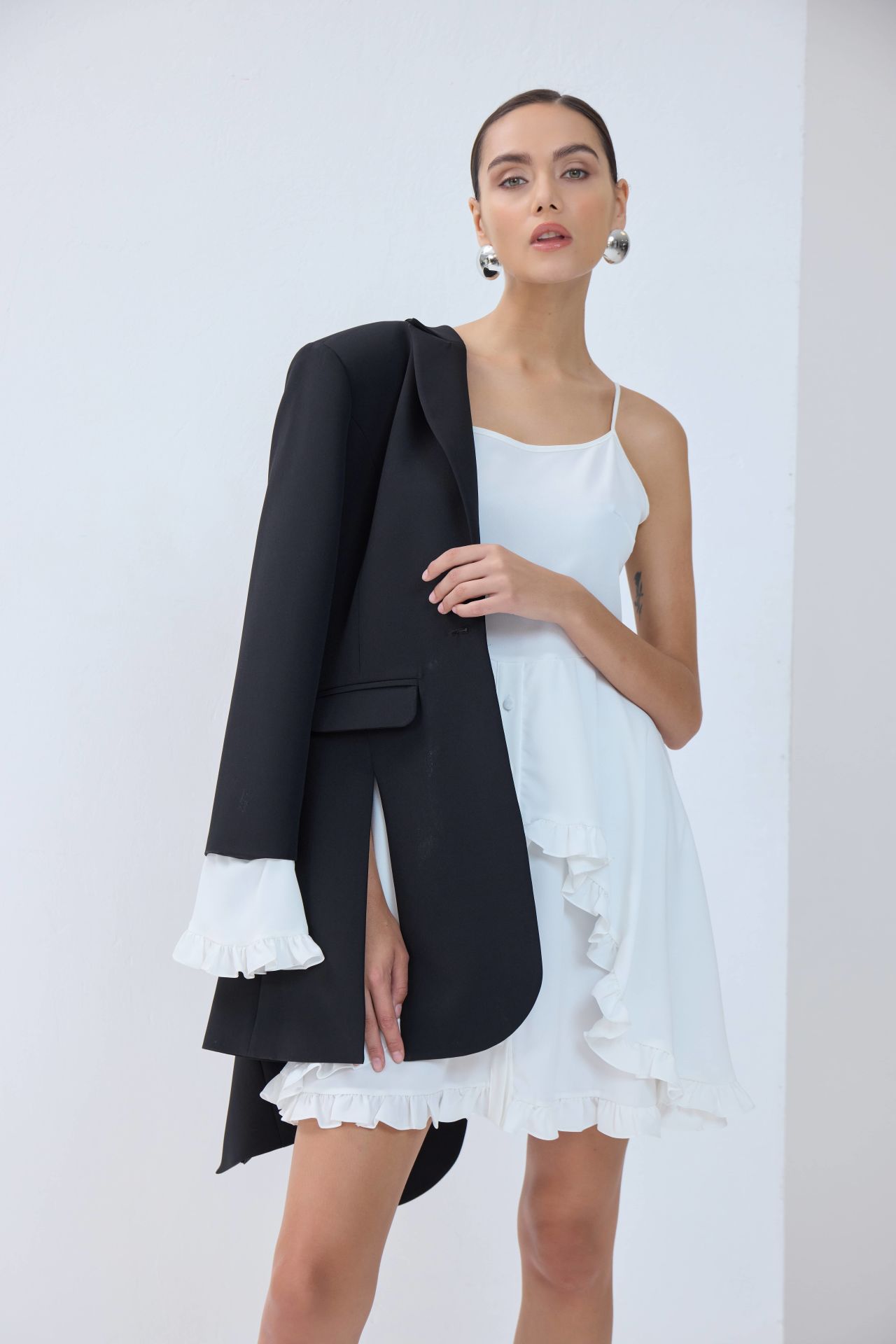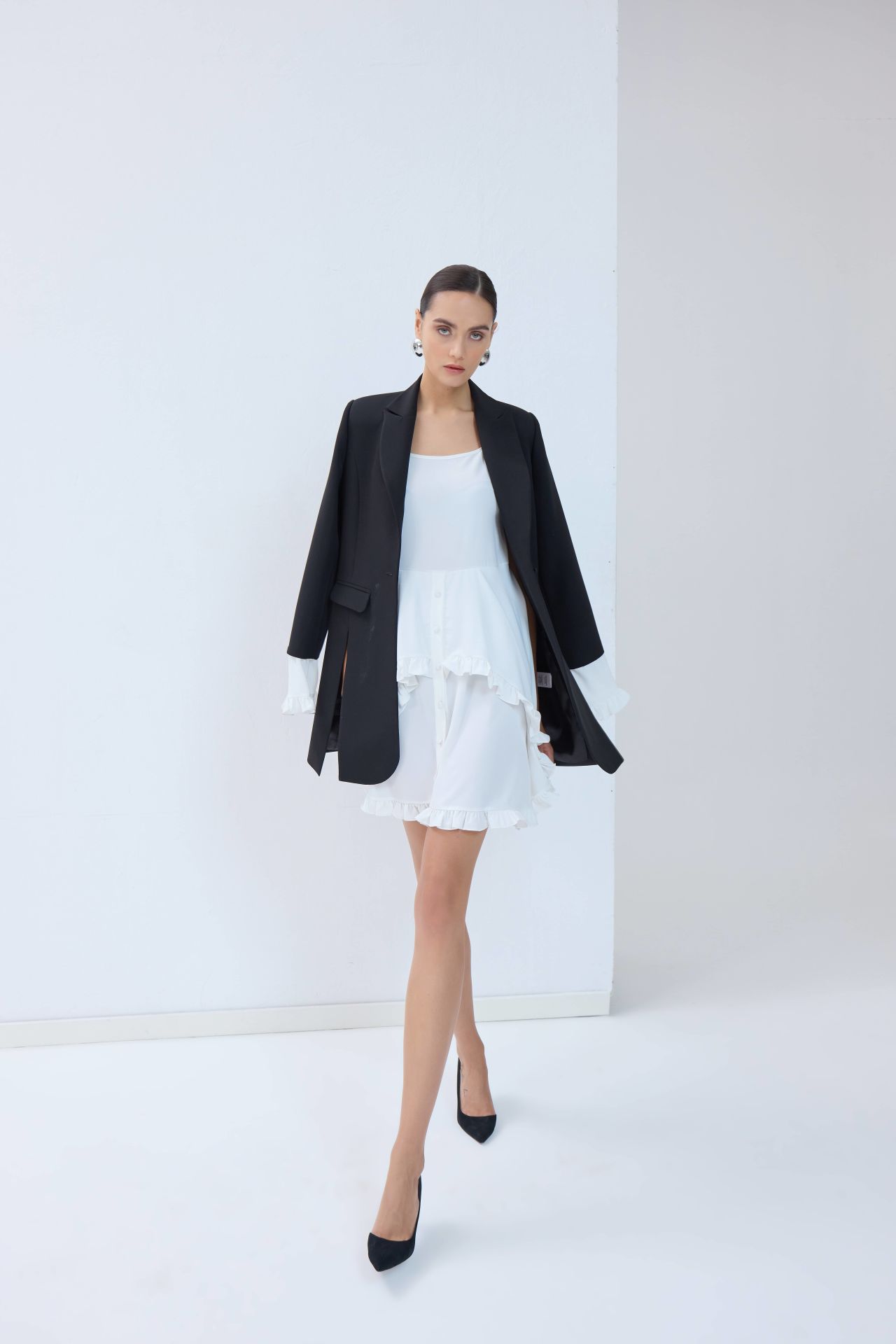 Takım İçindeki Beyaz Elbise Askılıdır. Ceket Tek Başına Kolları Fırfırlıdır. İçe Katlanarak veya Fırfırlı Şekilde Ayrı Olarak da Kullanılabilir.