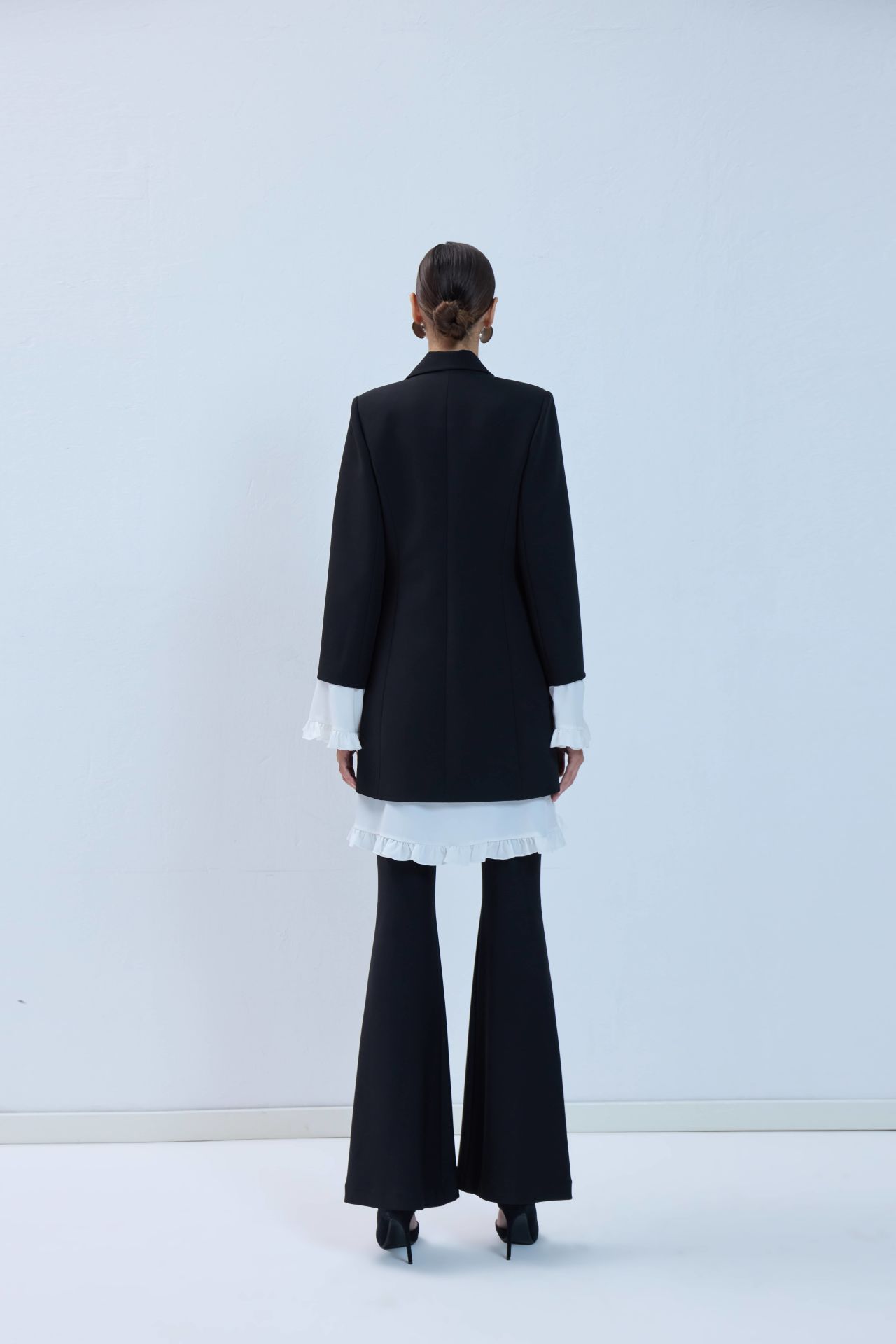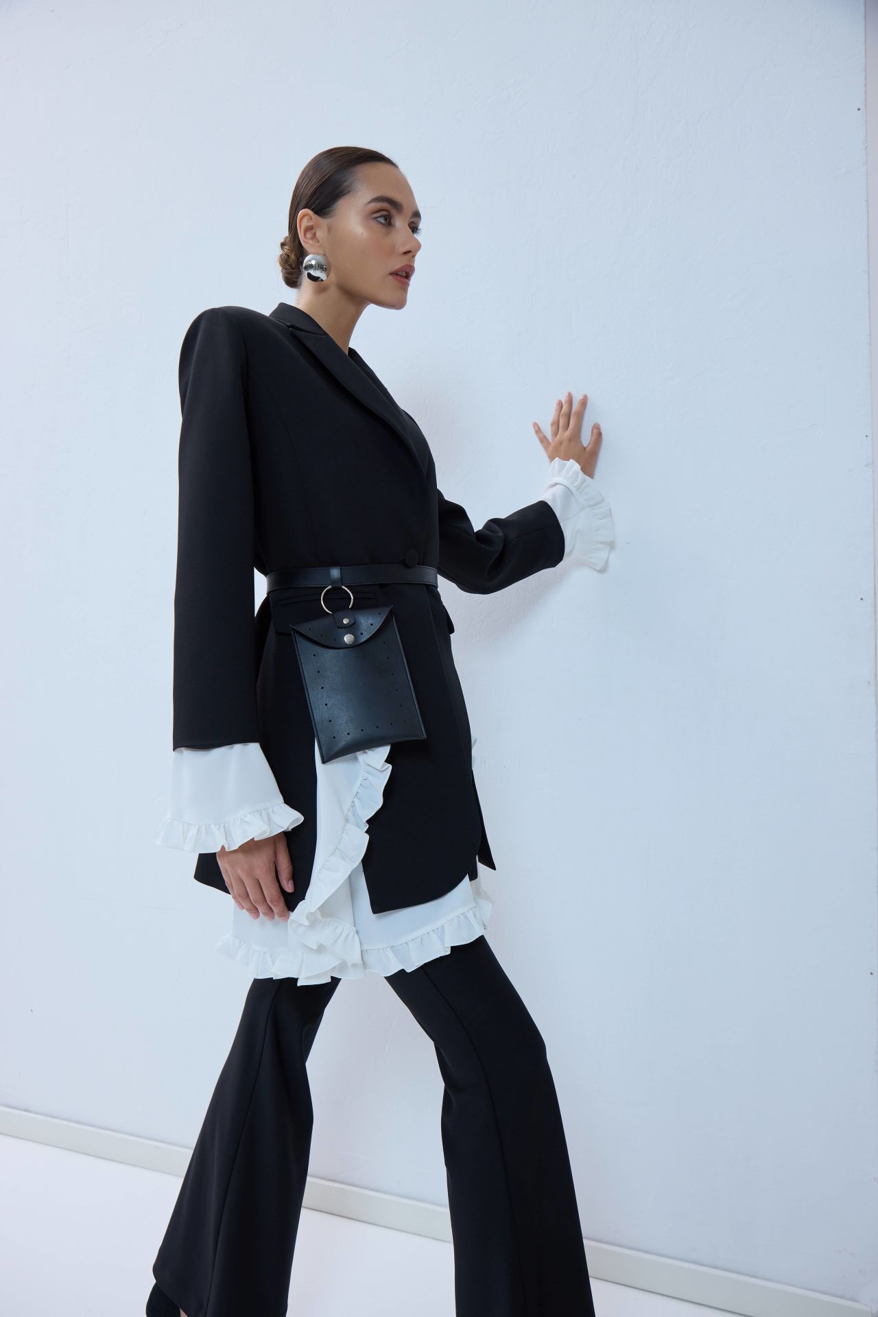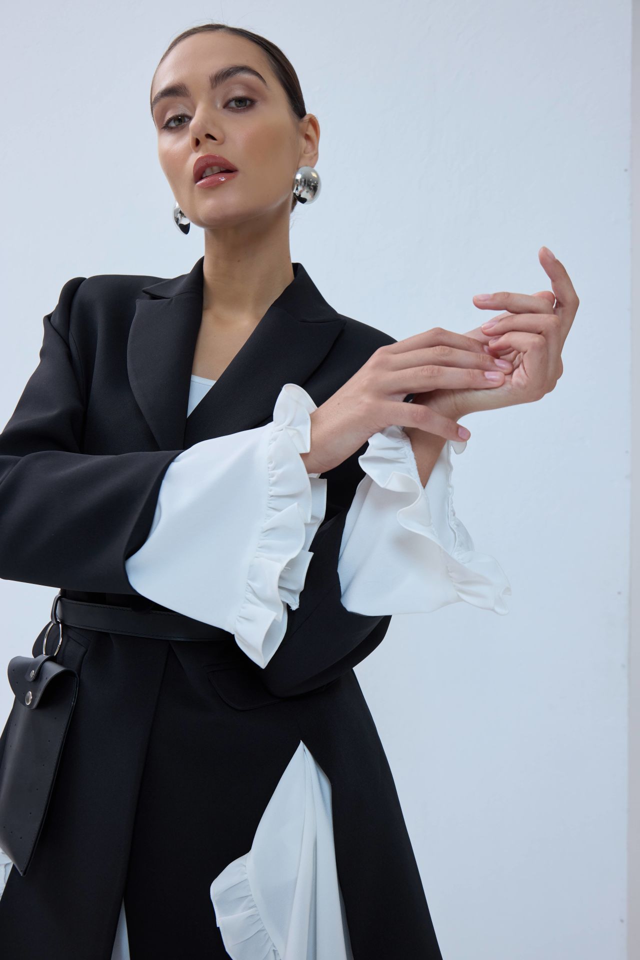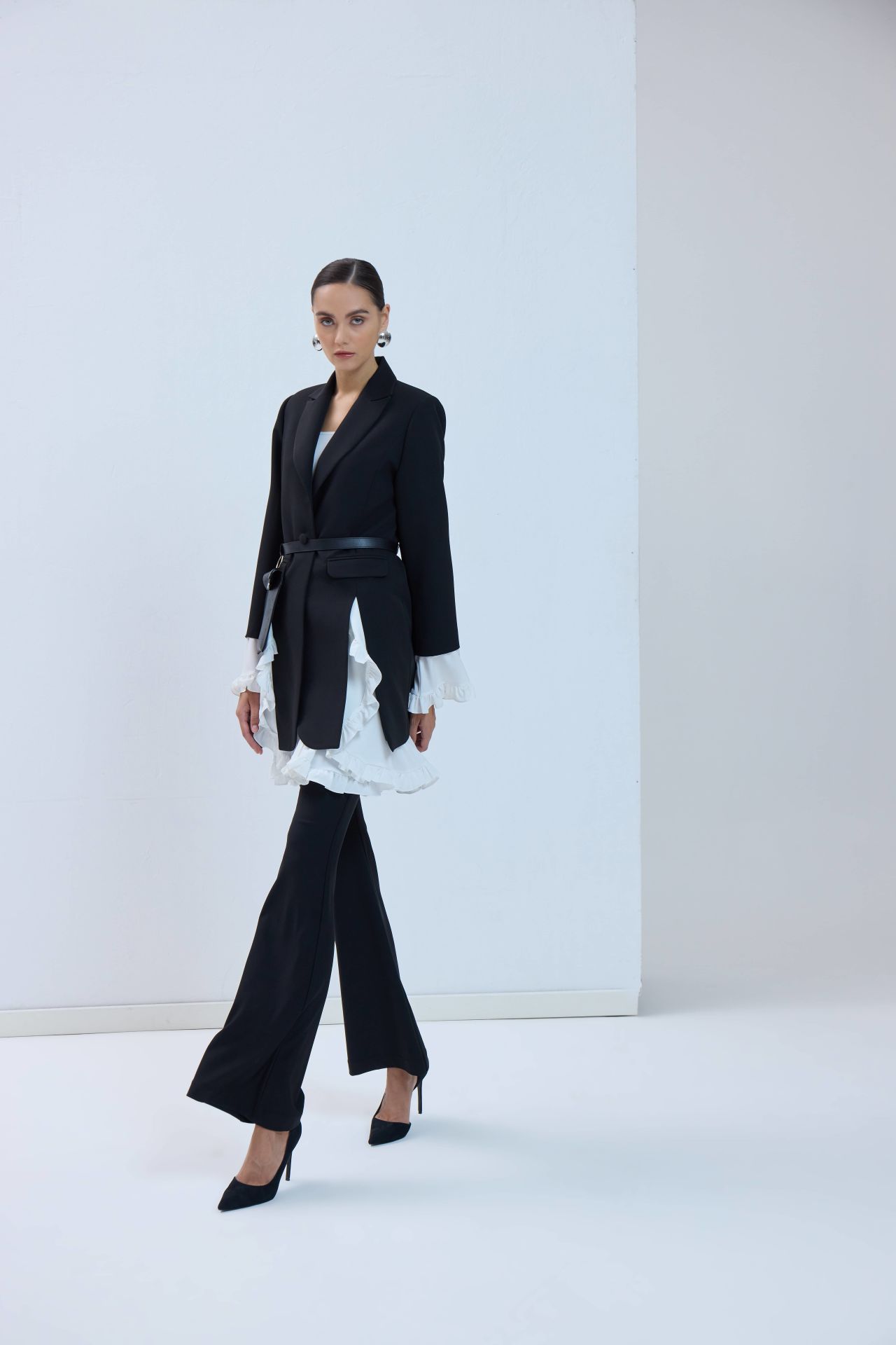Takım İçindeki Beyaz Elbise Askılıdır. Ceket Tek Başına Kolları Fırfırlıdır. İçe Katlanarak veya Fırfırlı Şekilde Ayrı Olarak da Kullanılabilir.