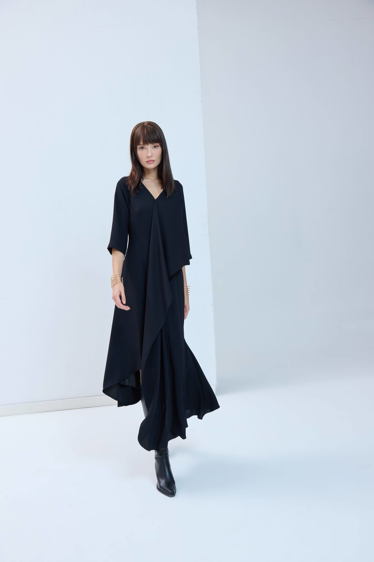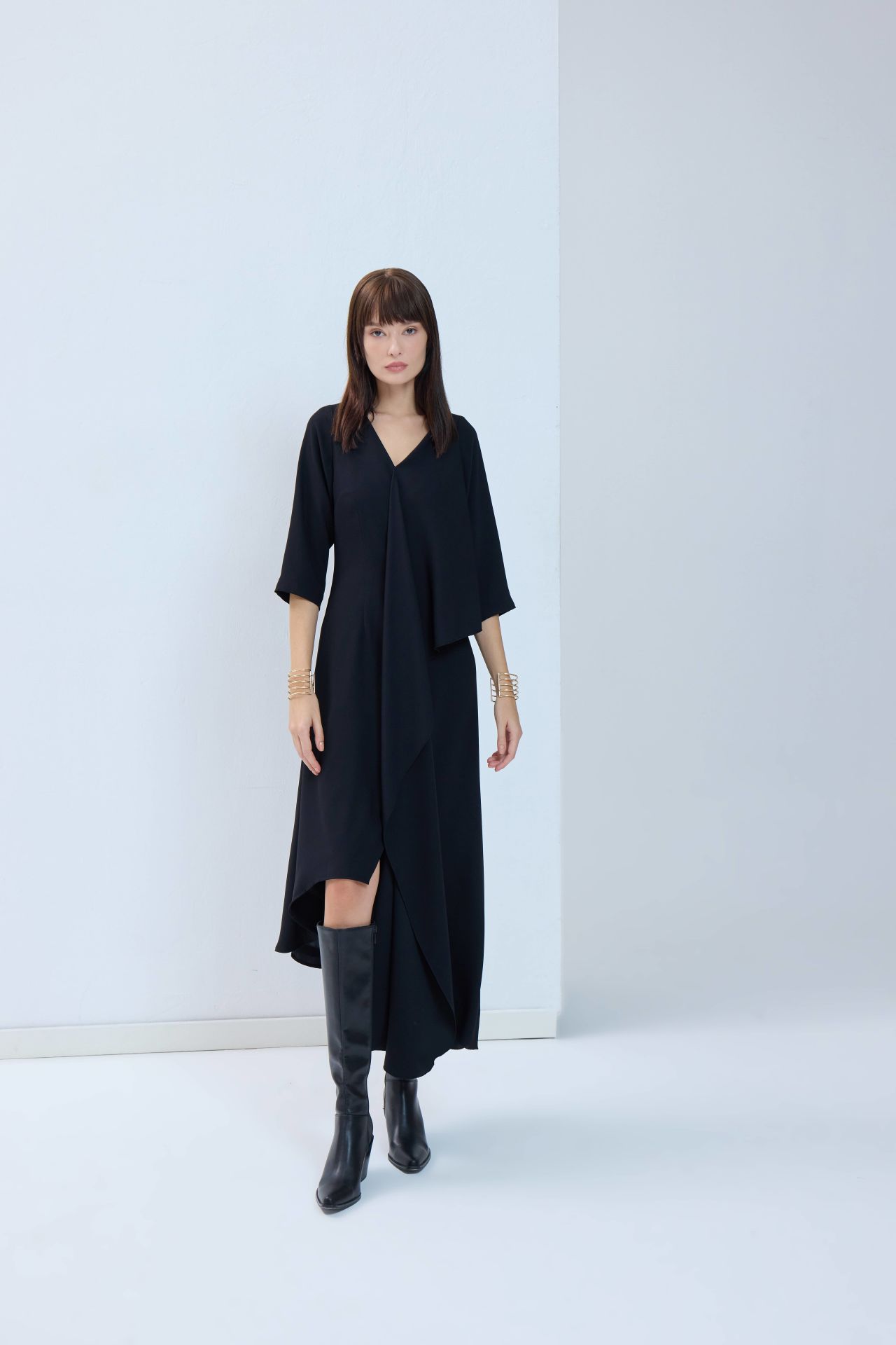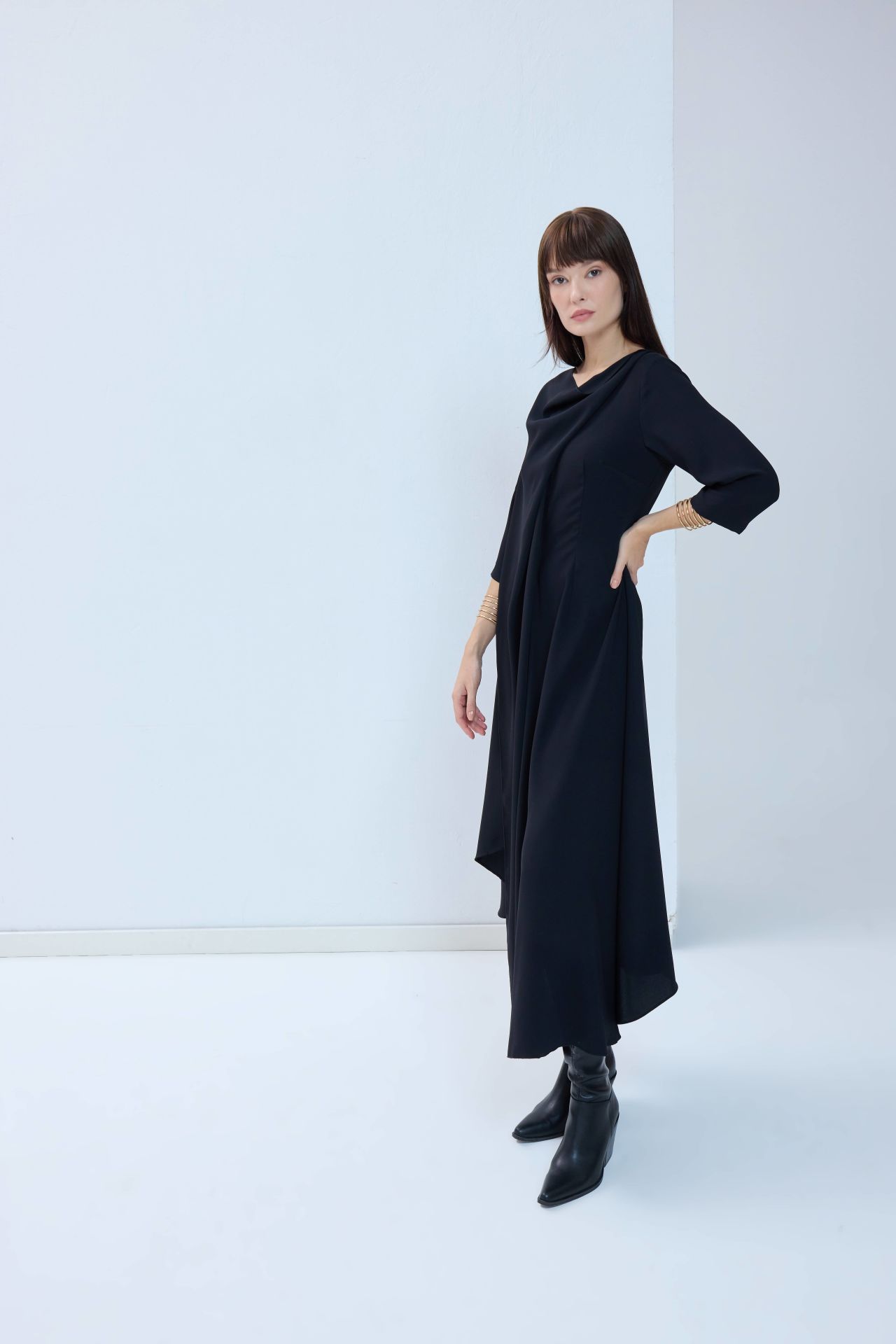 Tüm bakışları üzerinize çekecek, hayallerdeki o siyah elbise. Asimetrik detayları ve hafif kloş kesimiyle her bedende güzel ve asil durur. Özel tasarım elbisemiz önden ve arkadan V kesimli, sırttan fermuarlıdır.