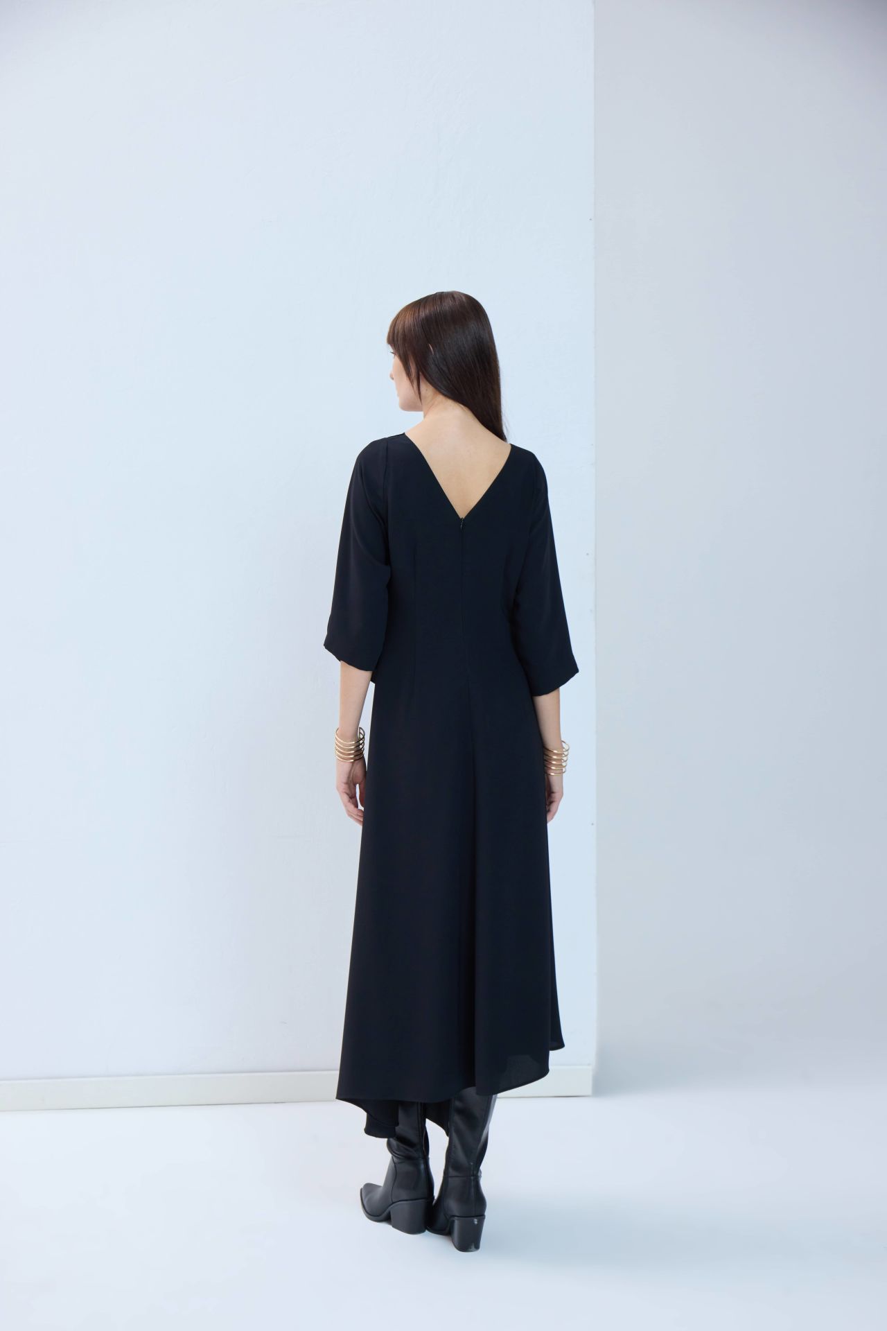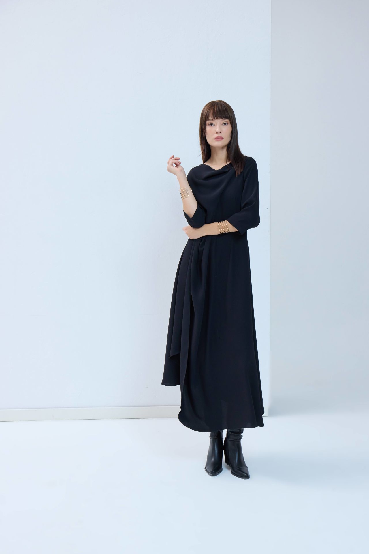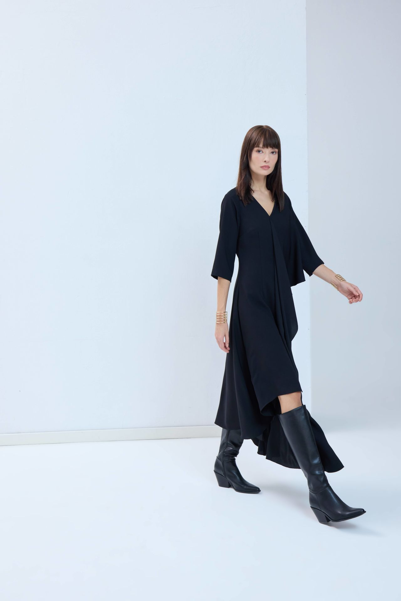 Tüm bakışları üzerinize çekecek, hayallerdeki o siyah elbise. Asimetrik detayları ve hafif kloş kesimiyle her bedende güzel ve asil durur. Özel tasarım elbisemiz önden ve arkadan V kesimli, sırttan fermuarlıdır.