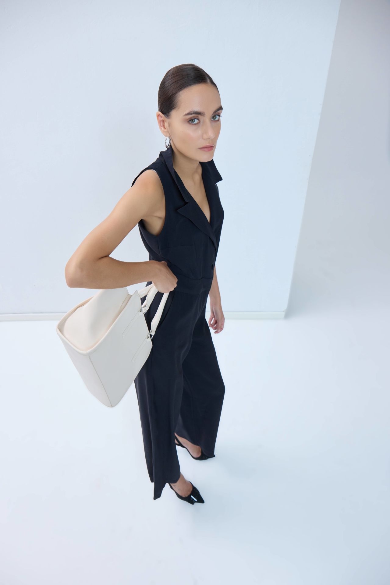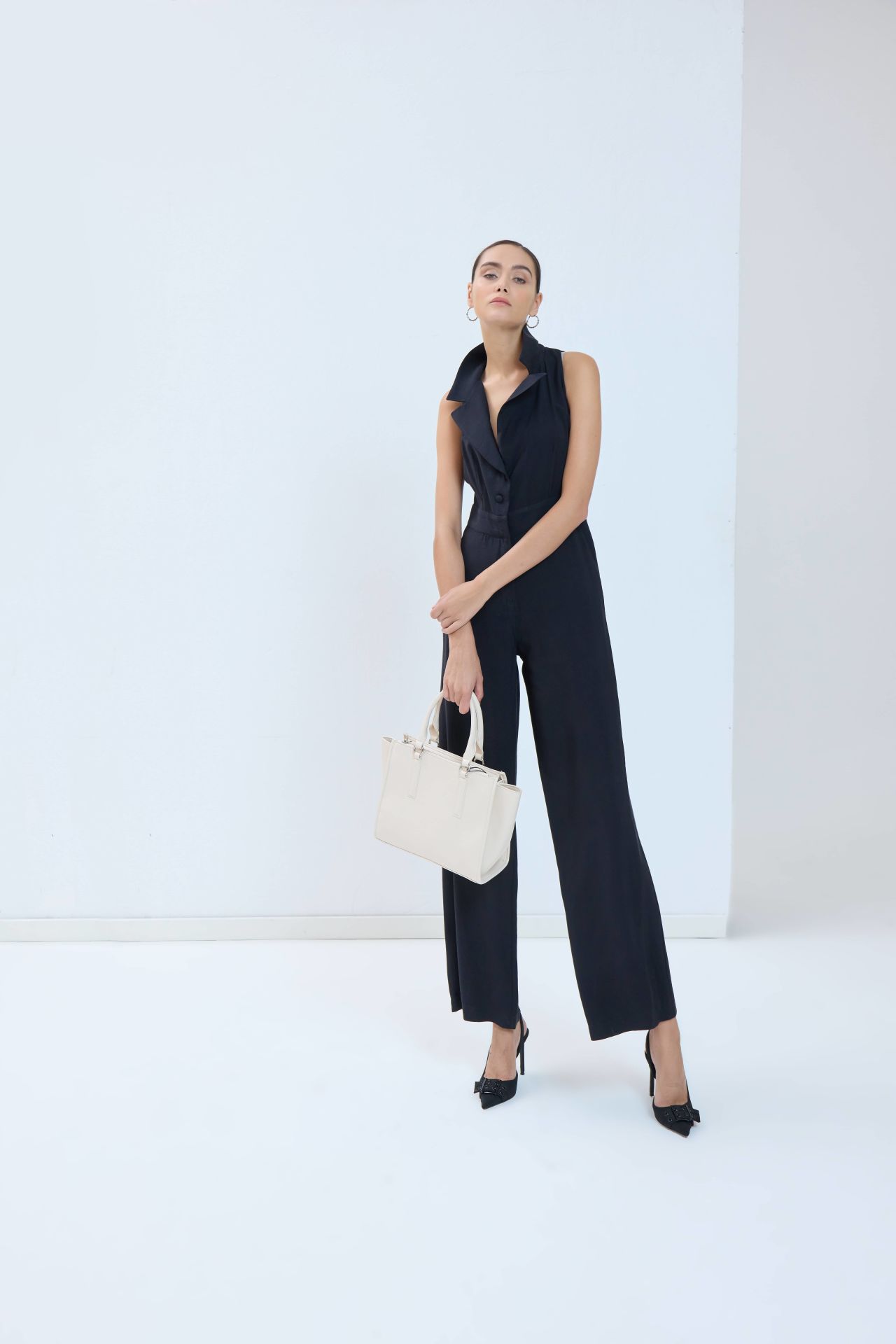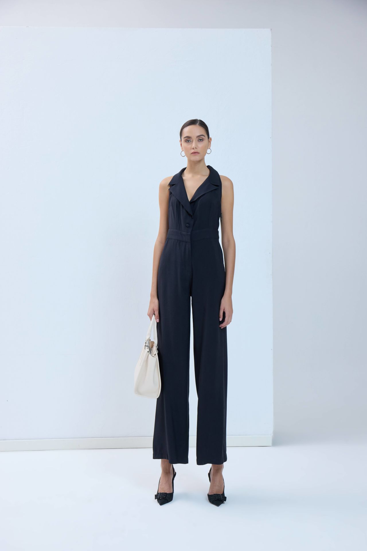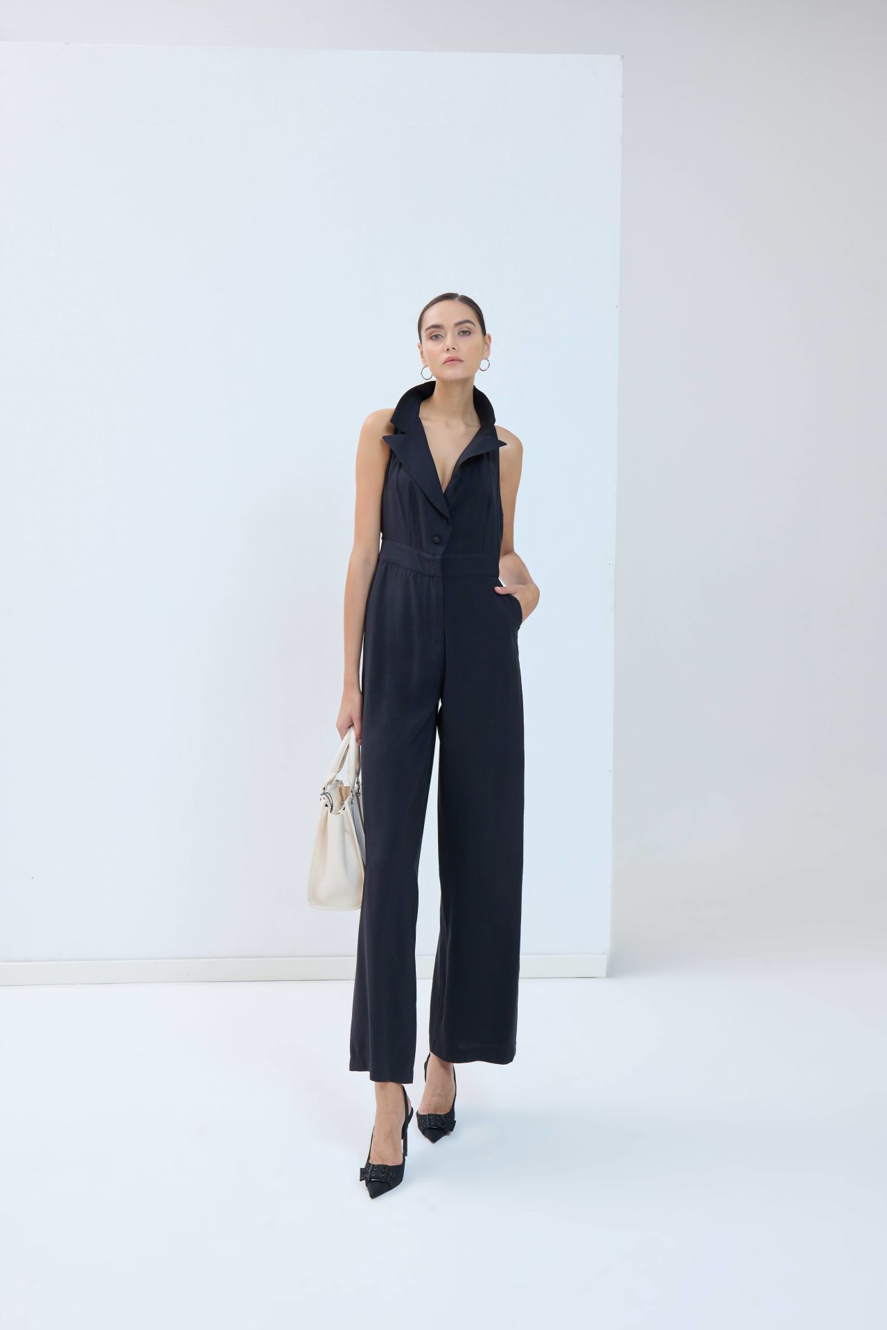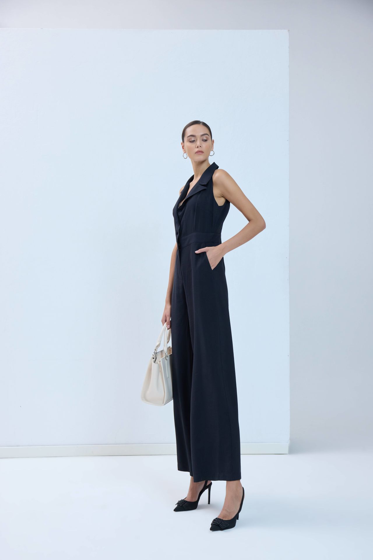 Reglan Kesimli Ceket Yaka, Kolsuz Modal Tulum - Siyah 103-4 Reglan Kesimli Ceket Yaka, Kolsuz Modal Tulum - Siyah