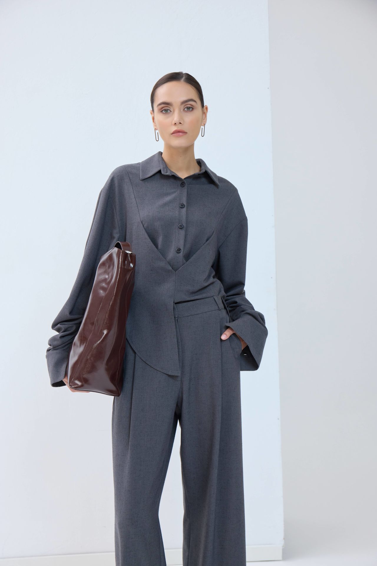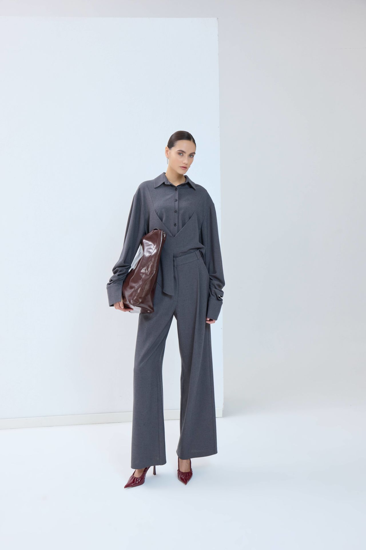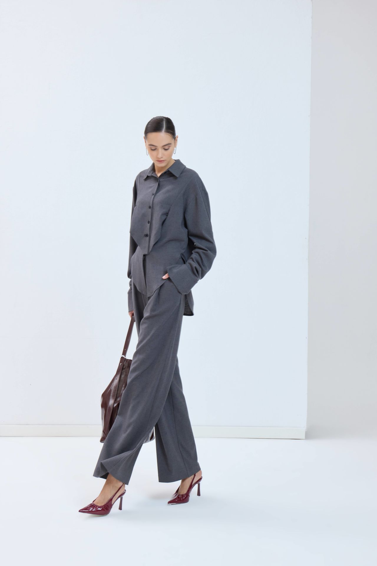 Farklı dizaynıyla ister kapalı ister yarı açık giyilebilen tasarım gömlek ve palazzo pantolon takım.