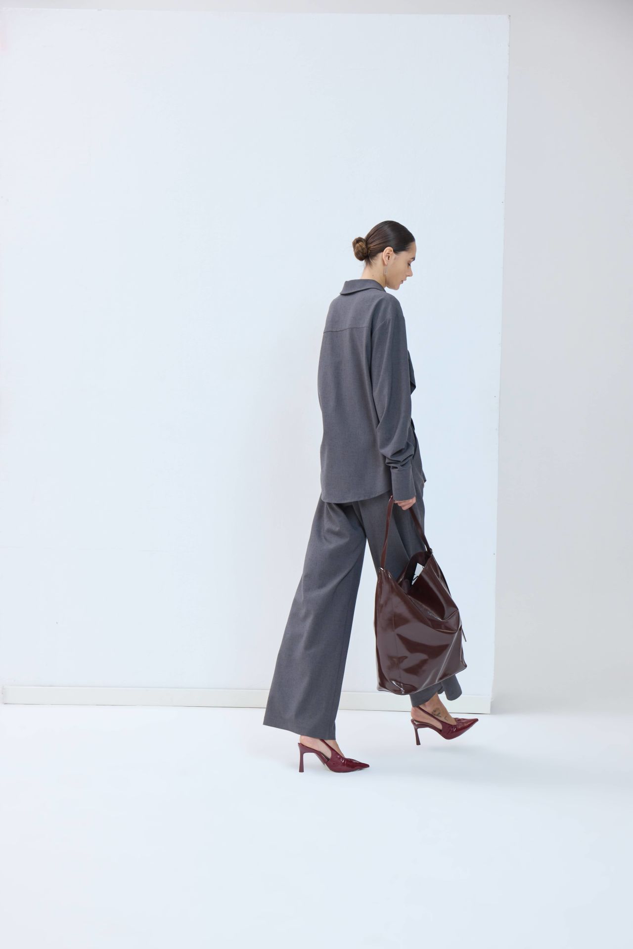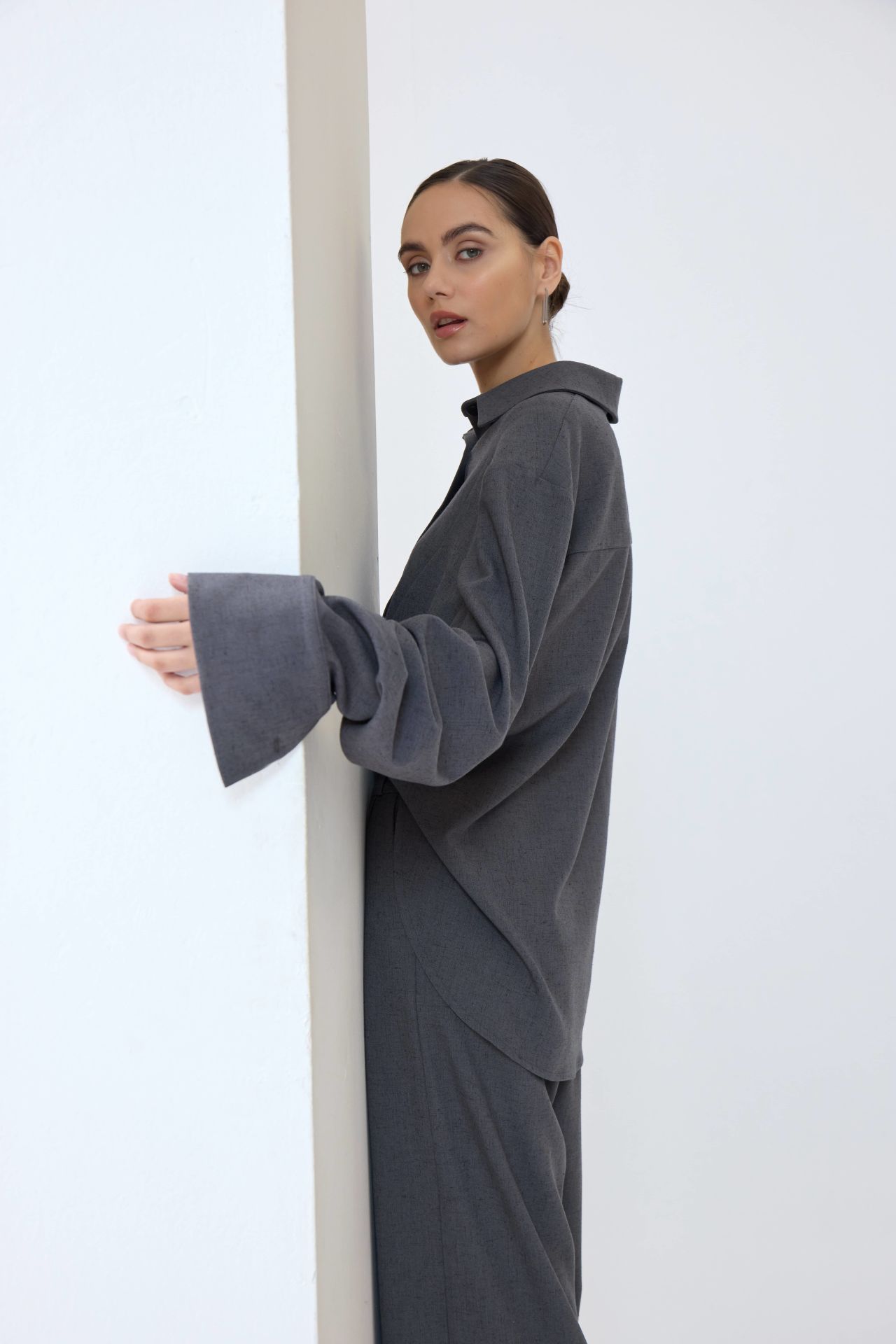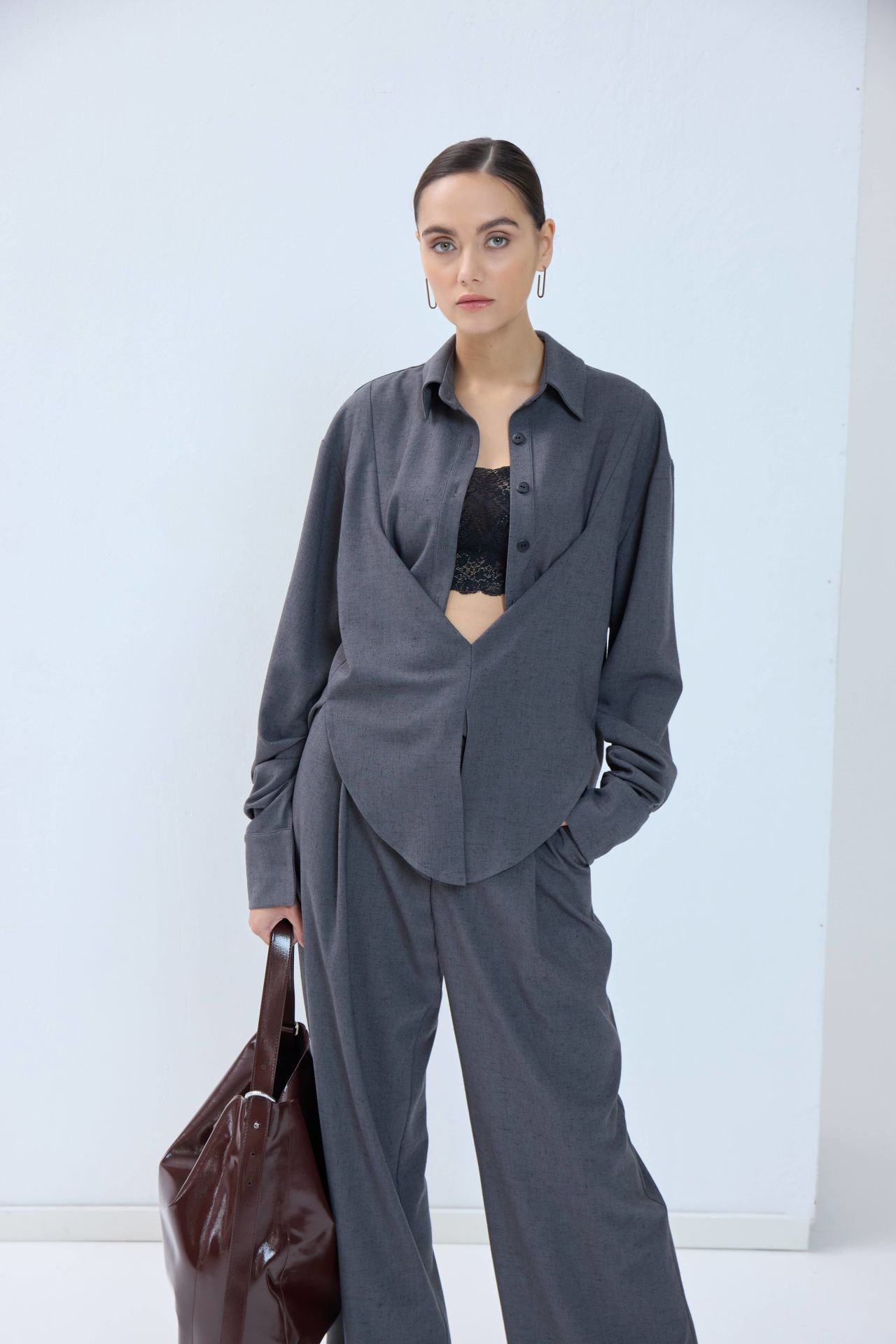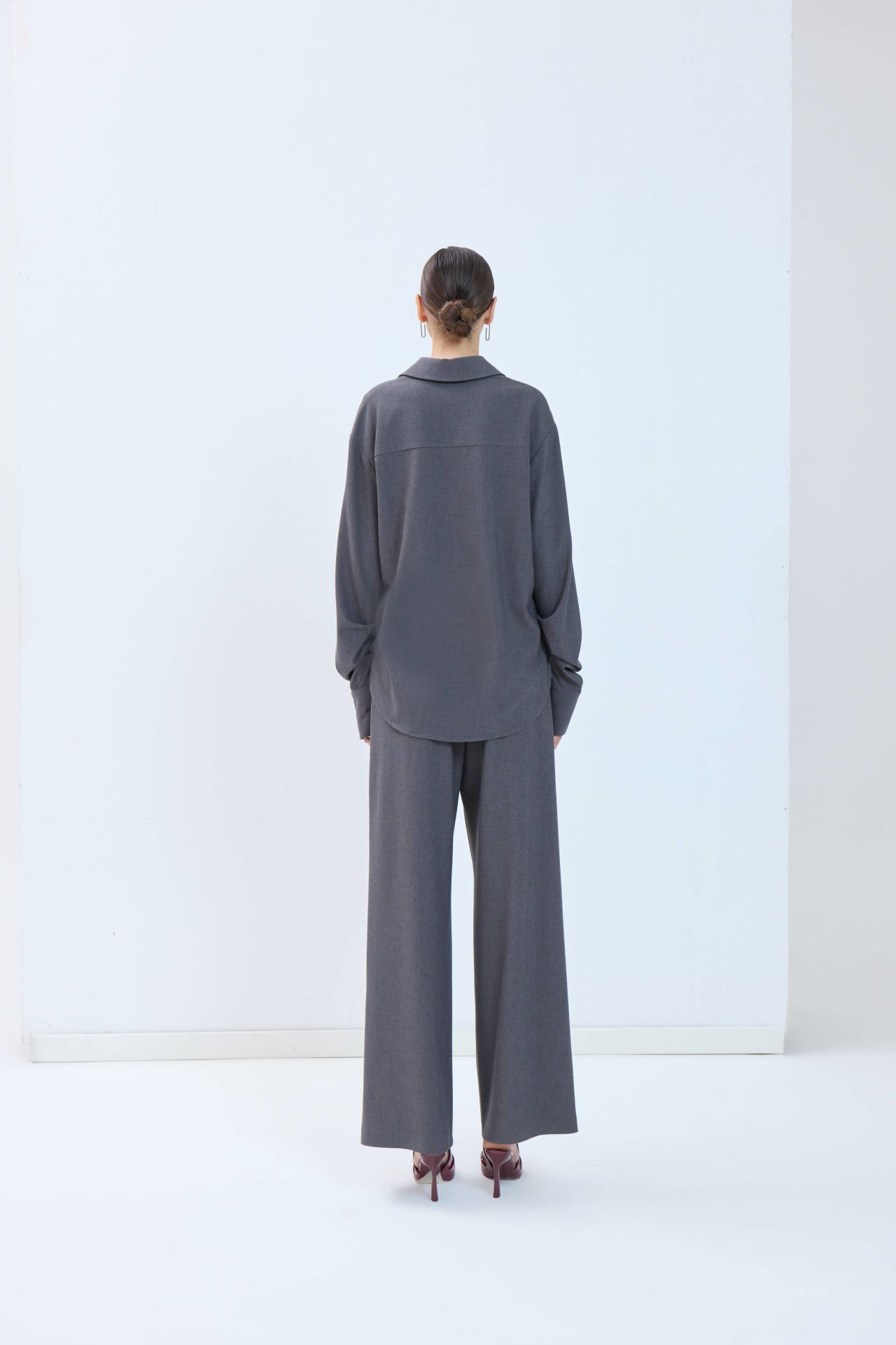 Farklı dizaynıyla ister kapalı ister yarı açık giyilebilen tasarım gömlek ve palazzo pantolon takım.