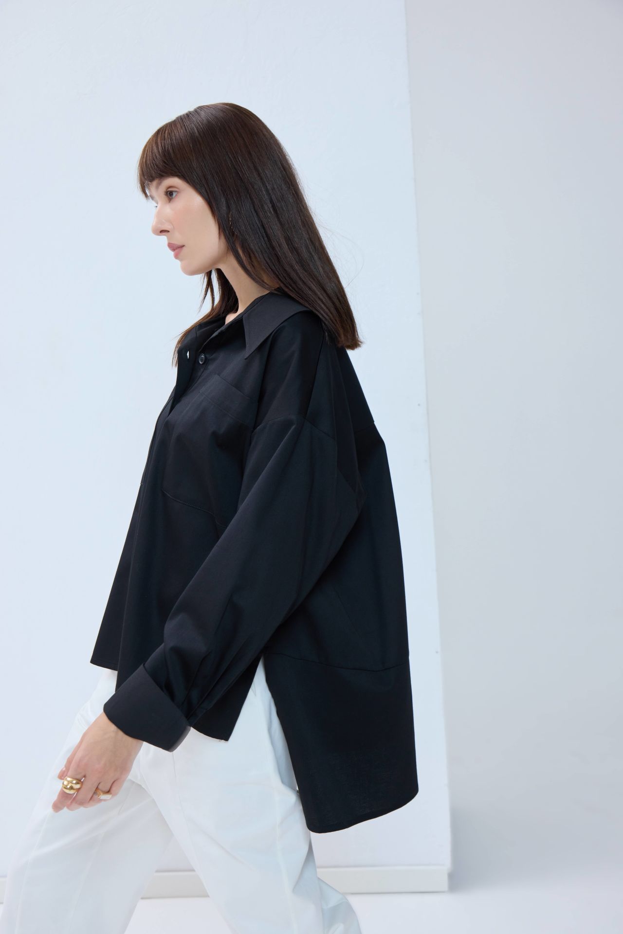 Mükemmel rahatlık için tasarlanmış yandan yırtmaçlı gömlek. Önden klasik uzunlukta, arkadan uzun, modern ve konforlu bir siluete sahiptir. Kalıbı oversize'dır.